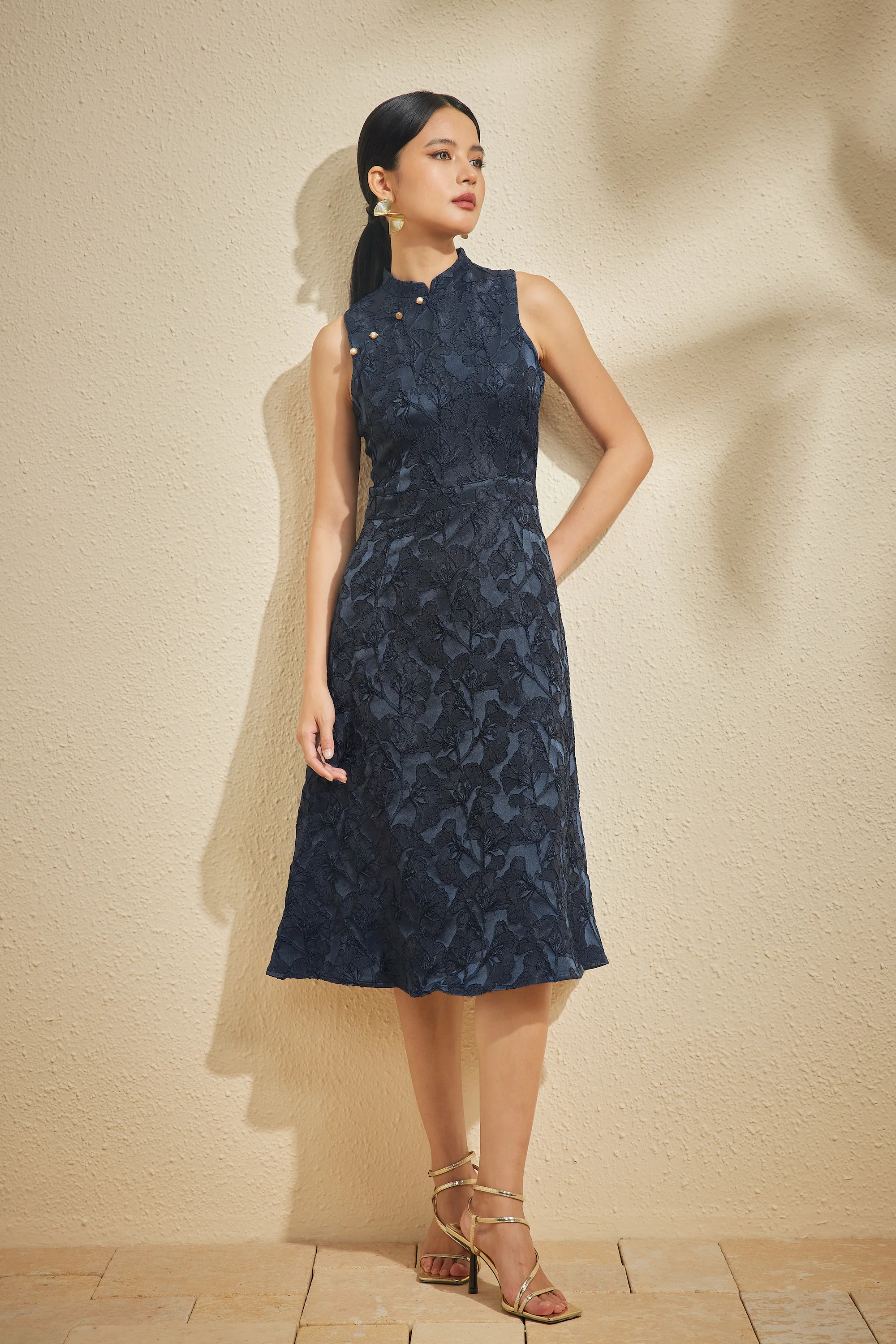 Inspired by Yang Guifei, one of ancient China’s Four Beauties, the Yokihi features a sleeveless fit-and-flare silhouette with a mandarin collar and a waistband that cinches the waist. Crafted from textured brocade, it’s the perfect timeless staple.